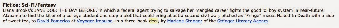 “Liana Brook’s JANE DOE: THE DAY BEFORE, in which a federal agent trying to salvage her mangled career fights the good ol’ boy system in near-future Alabama to find the killer of a college student and stop a plot that could bring about a second civil ward; pitched as “Fringe” meets Naked In Death with a side of sweet tea, to David Pomerico of Voyager Impulse, in a three-book deal, by Marlene Stringer of the Stinger Literary Agency.”